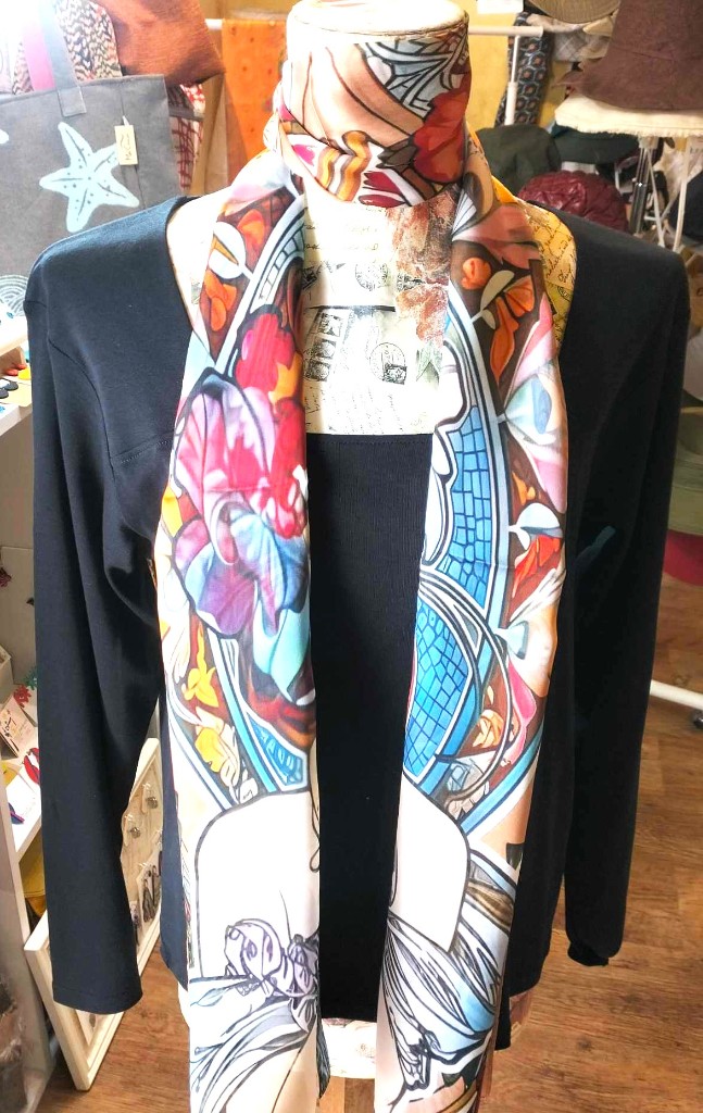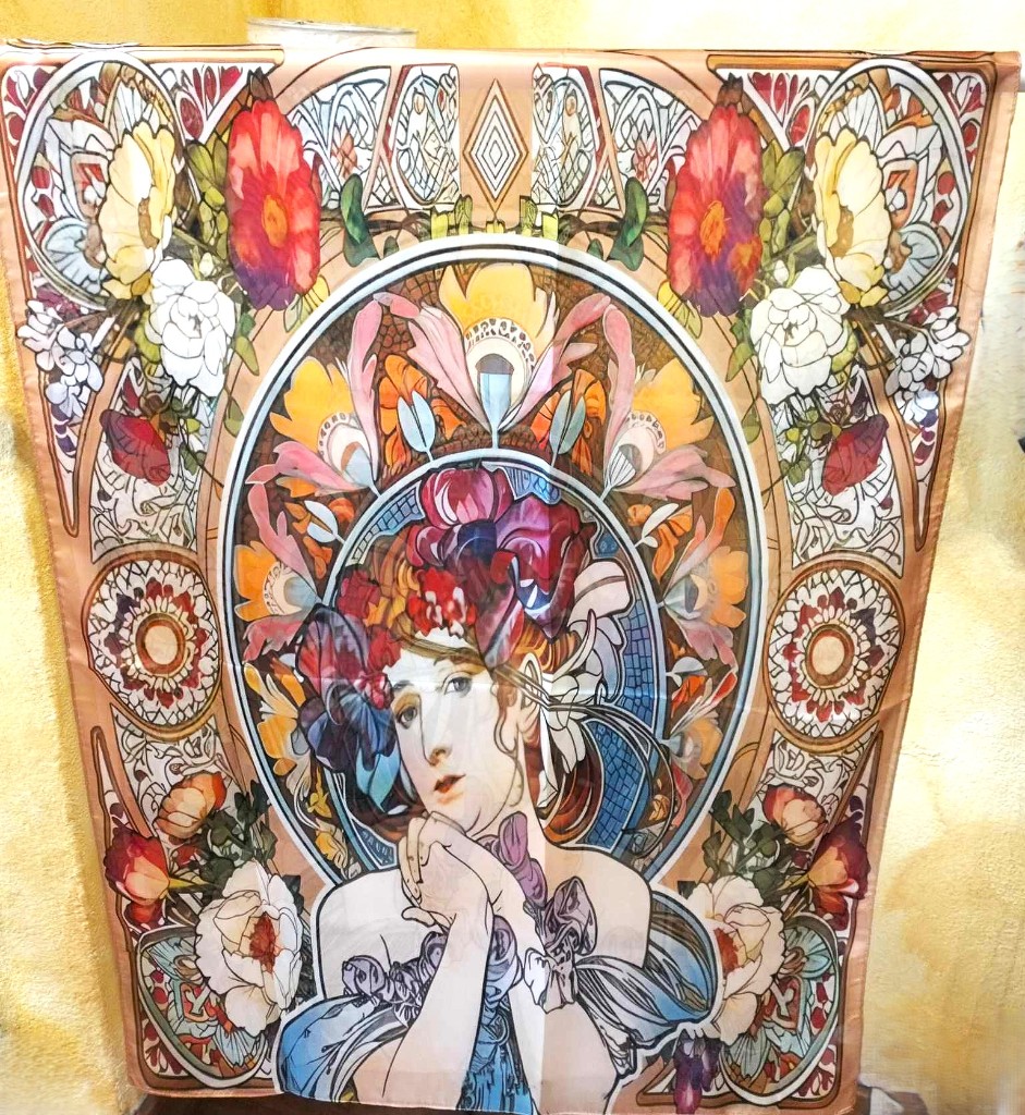 Fular de seda 70x180 con el motivo "La dama entre las flores" de Alfons Mucha.